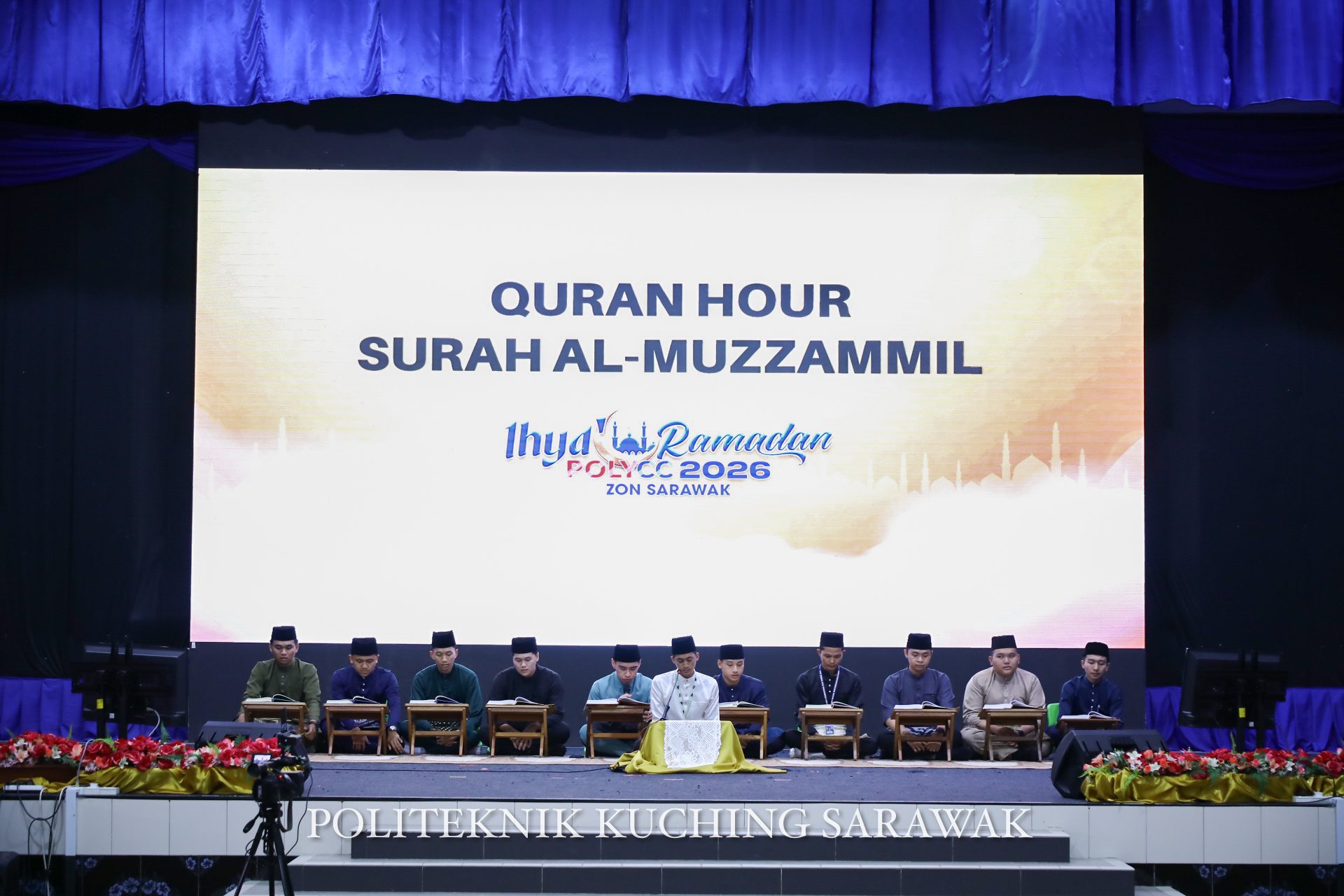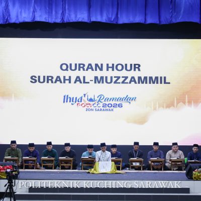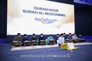 9 Mac 2026: Perpustakaan Seri Kenyalang telah melaksanakan Program Quran Hour 2026 bersempena Program Ihya’ Ramadan PKS POLLYCC zon Sarawak bertempat di Dewan Jubli Perak Politeknik Kuching Sarawak. Program ini telah dihadiri seramai 800 orang pelajar. Surah pilihan pada kali ini adalah surah Al – Muzzammil. Bacaan surah ini telah diketuai oleh Syed Mohammad Azim Bin Wan Hashim dibawah bimbingan Ustazah Zainab Binti Mohamad Ahmad.